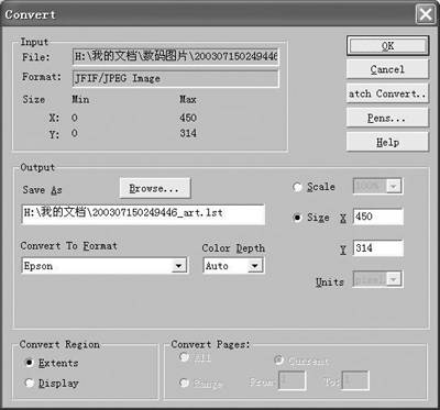 Panoramic还提供了转换文件格式的功能(图6),在“Output/Save As”小节中点击“Browse”按钮选择输出文件的保存位置,然后在“Convert To Format”中选择需要转换的文件格式,这里可以选择的文件格式大多是打印文件、位图文件、传真文件,可惜演示版本提供的文件格式不是太多,“Color Depth”可以设置色深,如果是图片文件的话,Size、DPI等选项也会呈可用状态,最后点击“OK”按钮即可完成转换。