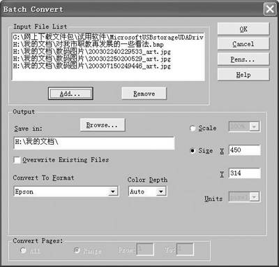 如果在图6中选择“Batch Convert”按钮,那么可以进入批量转换模式(图7),点击“Add”或“Remove”按钮可以增加或删除列表框中的文件,待设置好输出路径、转换格式及相应的设置后,点击“OK”按钮就可以一次完成了。