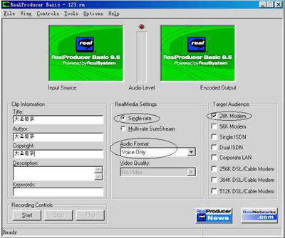 可以使用RealProducer(最新版本是v9.0)来压缩成RM文件。软件的使用比较简单,还有相应的向导模式可以配合使用。在设置时可以选择“Single-rate”和“Voice Only”及“28K Modem”(如图),这样设置所产生的RM文件的传输速率为16.0Kbps,这个水平完全可以保证大家的欣赏,很多官方的非音乐的RM文件就是采用这个传输速率的。都设置好后就可以压缩了,压缩的过程大约需要20分钟。