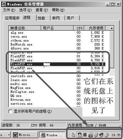 在Windows 2000/XP或Windows 2003系统下,如果使用FlashFXP时,频繁地进行最大化、最小化,或者按F9键将它最小化到系统托盘一段时间后,它在系统托盘里的图标就会意外消失,虽然它仍然在继续工作,系统里也有它的进程(见图,笔者开了四个FlashFXP,但系统托盘里却不见了)。