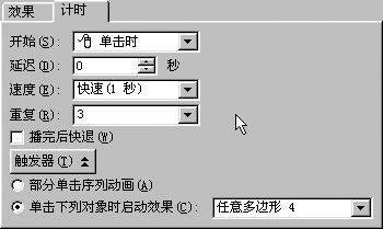 5.定义闪烁:在新绘制的图形对象选中的情况下,单击鼠标右键,选“自定义动画”项,将在屏幕右侧出现“添加效果”菜单,选择第二项“强调”中的“闪烁”效果,进行动画设置。选择“任意多边形”右边的向下箭头,选择“计时”命令(如图4),打开一个对话框,在“计时”选项中可以设置动画的开始播放方式,播放速度和重复次数,通过触发器的设置,定义动画效果的启动方式,在“效果”选项中,可以设置动画播放后是消失还是保留等等。播放时黄线条闪烁。