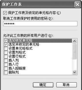 启动Excel 2002,打开相应的文档,切换到需要锁定的工作表下,执行“工具→保护→保护工作表”命令,打开“保护工作表”对话框(图1),根据锁定内容的需要进行适当设置,并输入密码(密码需要确认输入一次),按下“确定”按钮,这样当前整个工作表即被锁定,使用者只能浏览,不能对锁定项目进行处理。