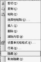 如果不想让使用者浏览某些行(列)的数据,可以这样隐藏:选中想隐藏的行(列),右击鼠标,在随后出现的快捷菜单中,选“隐藏”选项(图3),然后将工作表保护起来就行了。