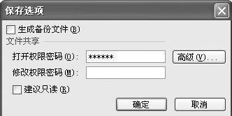 注意:如果在上述“保存选项”对话框的“修改权限密码”后面的方框中输入了密码,使用者如果没有密码,则只能以“只读”的方式打开该工作簿,可以浏览、编辑工作簿中的内容,但编辑的内容不能保存到原工作簿中(如果要保存编辑的结果,只有将工作簿文档另存一份)。