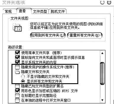 进入WinXP系统盘(假设为C盘),在任务栏里面选择查看→文件夹选项→查看一项中做如图2所示的修改。注意,除了要选中“显示所有文件和文件夹”外,还一定要把“隐藏受保护的操作系统文件(推荐)”一项前的钩去掉。