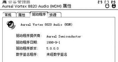 注:安装成功后的驱动信息,如图7所示。驱动显示为Aureal 8820驱动,版本为1998-9-1。