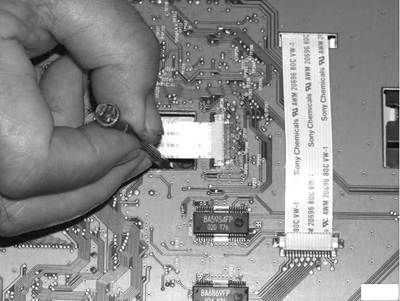 3.翻转DVD-ROM光驱,把固定电路板的四个塑料卡子轻轻拨开,取出电路板并向小电位器的方向移动一些,这时就可用小起子对小电位器进行调整了(图3)。逆时针方向调整为增大电流,顺时钟方向调整则是减小激光管的电流。