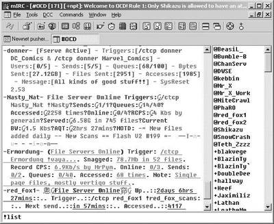 连接上Newnet服务器后,mIRC会自动弹出一个mIRC Channels Folder窗口。此窗口也可通过点击mIRC工具图标条的第三个图标唤出。输入频道名#OCD并确认加入。现在,你便在#OCD频道中了,中间的大窗口是主窗口,右边的一列是频道中的用户列表,最下方的长条即是命令输入行。