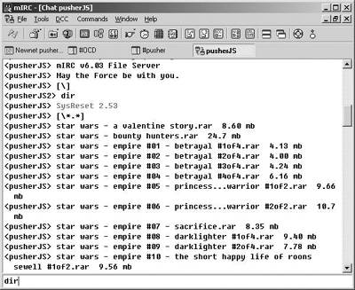 此信息提供了两个Trigger,第一个是关于漫画《星球大战》下载的。现在输入“/CTCP pusherJS Star Wars comics”,登入后输入dir查看文件目录(图5)。