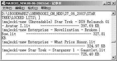这些频道的Trigger方式与#OCD略有不同。先输入“!list”,主窗口中即会列出所有的Trigger。注意Trigger信息中的“Type @xxx”这一句,@xxx即为从该Trigger获取文件列表的命令。在命令输入行中输入@xxx,获取的文件列表是一个txt格式的文本文件,用记事本打开查看(图6),选择你需要的电子书,在命令输入行中输入该命令即可加入到下载队列。