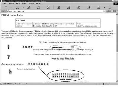 Filext网站提供了两种扩展名查询方法。直接搜索功能只要在方框中输入完整的文件扩展名,系统就会自动给出该扩展名的详细信息;字母排序式的模糊查询,也能让你很快地找到相应的扩展名(图1)。