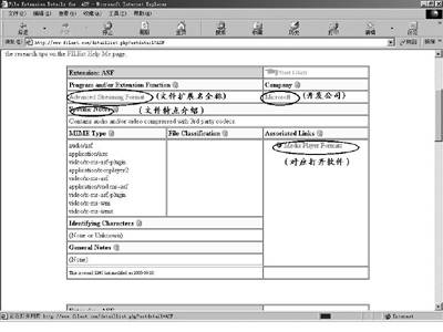 以查询ASF格式文件为例,结果如图2所示。虽然这些信息全都是用英文显示的,但是大家完全不用担心,只要抓住几个关键点,你照样能弄明白这种扩展名所对应的文件类型。Program and/or Extension Function和Company项就是扩展名的全称和开发公司的名称,点击这些内容的超链接,它还会自动把我们带到开发公司的官方网站上。