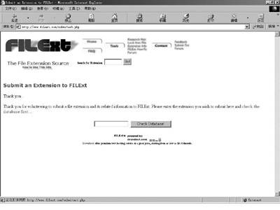 经过笔者亲自查询后发现,该网站对一些国产软件的扩展名的查询还有待加强(如北大方正的CEB格式就没有查到)。不过要是你知道这些扩展名的相关信息,那就赶快使用网站上的扩展名提交功能(Submitting)把它们也添加到网站的数据库中,为更多的网友服务吧(图3)!有了它,还会为打不开陌生格式的文件发愁吗?