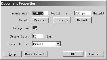 Step1:更改文档属性:运行Flash MX,按“Ctrl+J”打开“Document Properties(文档设置)”对话框,更改当前文档大小为550×200px,并设定“Background(背景色)”为#003366(图2)。