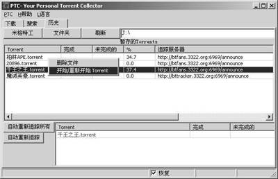 如果中途由于某些原因中断下载,可以重新运行PTC,单击打开“历史”选项卡,从列表中找到需要恢复的Torrent文件,单击右键,选择“开始/重新开始Torrent”,这时PTC会对该文件进行扫描并自动续传(图3)。