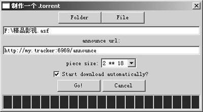 最后介绍一下如何使用PTC制作Torrent文件并发布,也就是怎样将机器上的文件提供给别人使用BT下载。从PTC菜单中执行“制作一个Torrent”,在弹出的窗口中单击“Folder”或“File”按钮,找到准备要共享的目录或文件并打开,然后在“Announce URL”栏中填写发布服务器的地址信息,这个地址在相关的论坛上都会公布。设置完成后,直接点击“Go!”,等到进度条结束时就说明Torrent文件已经制作完成(图4)。现在可以关闭这个窗口,回到程序的主界面,这时在刚刚做的文件“指引”栏中会显示“下载成功!”的字样。