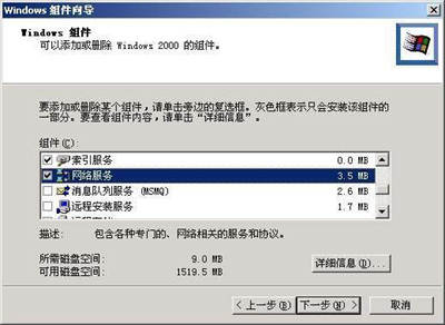 1.在操作系统上安装DHCP服务(操作系统推荐采用Windows 2000 Server)。在“控制面板”中选择“添加/删除程序”,再点击“添加Windows组件”进入“Windows组件向导”(图1),选中“网络服务”中的“动态主机配置协议(DHCP)”即可安装DHCP服务(图2)。