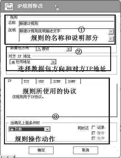 单击工具栏的“增加规则”按钮,就会弹出新建IP规则属性窗口(图1)。