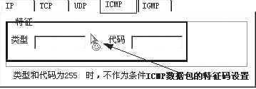 ICMP协议设置如图3所示,在特征区域的类型和代码框中可输入0~255之间的数字,每个数字代表一种类型的ICMP协议数据包,当输入“255”时,表示类型代码不作为条件使用。
