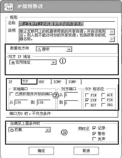 ②本地端口应设置为“从134到139”,对方端口为任意,即“从0到0”,TCP的标志位为“SYN”。