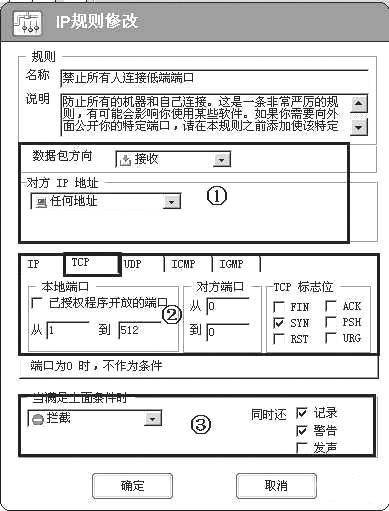 这是一条非常严厉的IP规则(图11),有可能会影响你使用某些软件。应用此IP规则后,所有用户都不能连接你的低端端口。对于一般只是上网浏览网页的用户来说,是可以使用的。