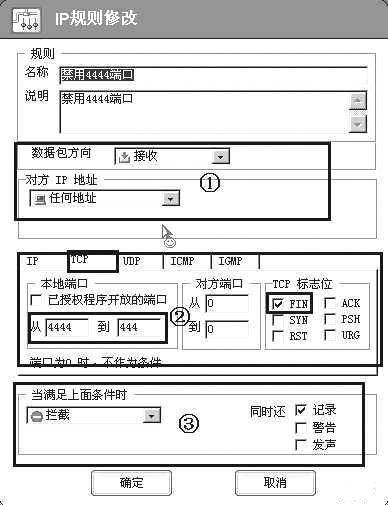 ②选择使用TCP协议,本地端口使用“从4444到4444”,对方端口不限制,“从0到0”,TCP的标志位为“FIN”。
