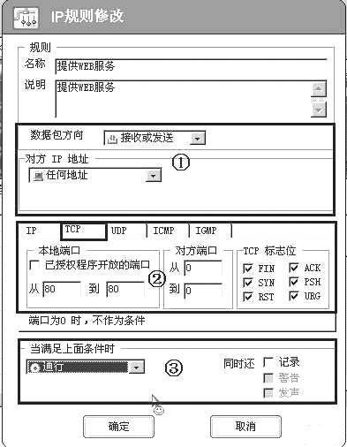 ②Web服务使用TCP协议,本地端口为“从80到80”,对方端口“从0到0”。TCP标志位为“FIN、ACK、SYN、PSH、RST、URG”。