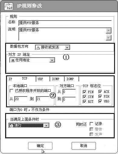 ②FTP服务使用TCP协议,本地端口为“从20到21”,对方端口“从0到0”。TCP标志位为“FIN、ACK、SYN、PSH、RST、URG”。