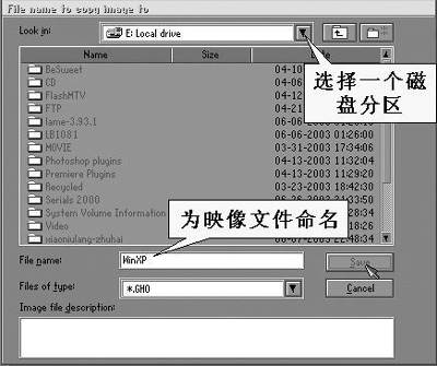 之后会弹出图3的对话框,先选择要保存映像文件的磁盘分区(这个分区的剩余空间应大于系统分区的已用空间),并为映像文件命名,然后单击“Save”按钮。接下来会弹出压缩映像文件的对话框,可选择No(不压缩)、Fast(低压缩比,速度较快)、High(高压缩比,速度较慢)三者之一,根据自己的机器配置来决定就行。在最后确认的对话框中选择“Yes”后,即开始制作系统分区的映像文件。
