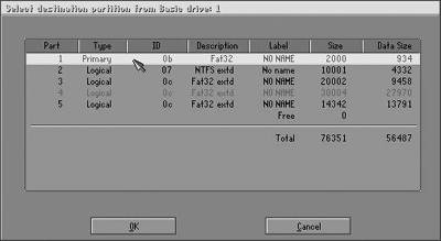 接下来会要求你选择一个硬盘驱动器,如果有多个硬盘可根据硬盘的大小进行判断,如果两个硬盘一模一样就根据IDE接口的顺序和主从盘来判断,主盘在前、从盘在后。然后要求你选择分区(图2),选择要备份的系统分区就行了。