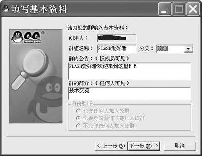2.在弹出的“申请群组向导”窗口中,选择创建的群类型:固定群或者临时群。这里我们选择创建临时群(如图2)单击“下一步”按钮。然后在 “填写基本资料”窗口中,填入所创建群的名称、简介、公告,如“Flash爱好者”等,单击“下一步”按钮(如图3)。