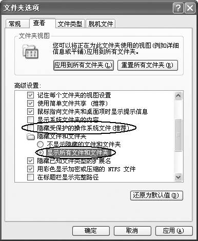 3.在“查看”选项卡的“高级设置”区域中,通过滚动条找到并去掉“隐藏受保护的操作系统文件(推荐)”复选框前的“√”标记,并且在“隐藏文件和文件夹”下选中“显示所有文件和文件夹”项(如图1所示)。最后单击“确定”按钮。