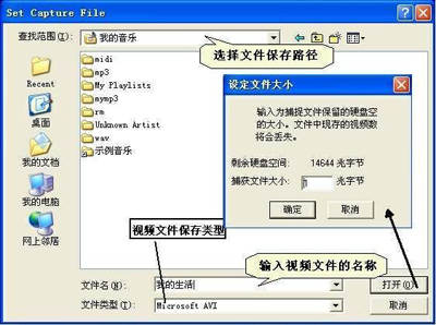 ⑦点击“打开”按钮,弹出 “设定文件大小”对话框,此项“捕获文件大小”可以不设定,视频文件的大小根据录制的时间而定。