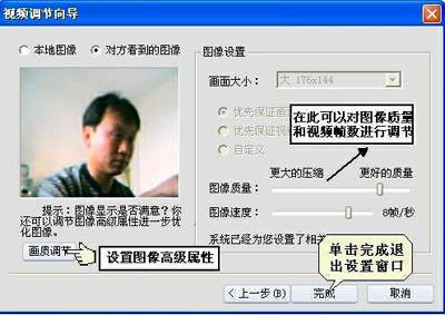 ⑤音频设置完后,可以对图像的质量和速度进行调节。还可以通过“画质调节”来调整画面质量(设置方法与用摄像头拍照图像的设置方法一样)。