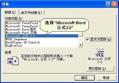 豆仔提示:安装Word的公式编辑器以后,“对象类型”中才有“Microsoft Word 公式3.0”选项,如果看不到此选项就需要选择安装公式编辑器。