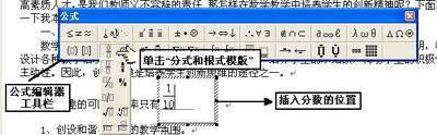 ③随后弹出“公式编辑器工具栏”。工具栏中提供了很多公式模板,输入分数时单击“工具栏”中的“分式和根式模板”,在模板下拉菜单中选择一个合适的分式模板样式。