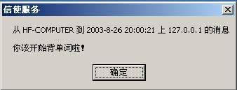 比如想让计算机在20:00分的时候提醒你背单词,只需在“开始→运行”里键入“at 20:00 net send 127.0.0.1 你该开始背单词啦!”(不带引号),并单击“确定”按钮。到了规定的时间,屏幕上就会准时飞出一个信使窗口(见图)。有了这个小秘书,你还会担心自己记性不好吗?