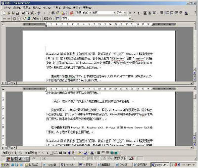 “一分为二”看文档 硬件周刊 LanFu 你是不是经常在Word中对比和修改比较长的文档,是不是感觉来回翻页很麻烦?其实有简便的方法──使用Word 2000/2002的“拆分”功能。 选择菜单栏上的“窗口→拆分”,或者双击右边滚动条上方的横条,文档的主窗口便分为上下两个子窗口(见图),对于每个窗口都可以单独操作,查找和对比文章的前后部分非常方便。取消拆分窗口时,只需双击两个窗口之间的水平分拆线即可。