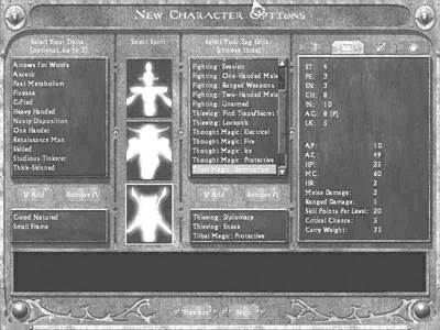 《狮心王》中一共包括30个技能(skill)、40个特技(perk)以及15个特性(trait),再加上4个种族、6种属性、4个学派的魔法。没有两个角色是一样的,推荐诸位尝试以自己的方式有个性地进行游戏。因此在这里只作一些概略的分析。