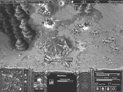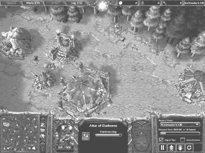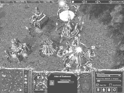 通过图1和图2我们可以看到双方的开局。相对来说兽人的开局中规中矩:祭坛—地堡—兵营,但亡灵的开局(坟场—墓地—通灵塔—祭坛)则颇值得人们研究,特别是对很多还没有进入高手行列的玩家来说,具有很高的参考价值。这种亡灵的开局最大的好处是在死亡骑士出现后,至少可以拥有两个地穴恶魔来作为MF的辅助。