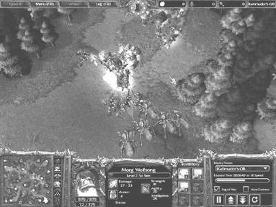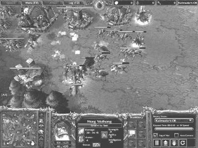 死亡骑士跑到地精商店处大肆Shopping,购买了两个生命药剂和一个魔法药剂,此后利用庞大的部队冲击基地上方的地精工厂。另一方面兽人也利用飞龙来打击另一处无法对空攻击的地精工厂Creep,不过兽人的英雄也投入了战斗,很明显这有些操之过急,不但平白无故地损失了HP,而且不捡取宝物的低级错误也再次重现,一个增加300点生命的宝物居然被视而不见(图6)!