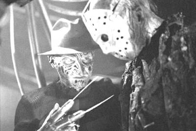 前一时期,轻松或怀旧的影片一直是票房的主流基调,而现在恐怖片的风潮又来临了。资深恐怖电影迷们对“新线公司”肯定不会陌生。该公司有两部最著名的恐怖系列电影:《榆树街噩梦》(国内D版很多翻译为《猛鬼街》)与《13号星期五》(Friday the 13th)。如果有朝一日,两个魔界名流(一个冰球面具,默默无语;一个黑色礼帽,锋利长刀~)“碰头”在一起会发生怎样的情况呢?!《弗莱迪大战杰森》恐怕就是为了解答这个问题而诞生的~(如图)争斗是免不了的啦。至于输赢的结果,看完影片自然知晓,但是网上也早早就有了一个评选(该片官方网站的民意调查),就目前的调查结果,从不说话的面具杀人狂杰森比多嘴的弗莱迪得到了更多支持!(笔者暗想:如果影片大结局并非观众们所预测的~那来年会不会出续集呢!很有可能。这是好莱坞的一贯手法!)该片目前居全美票房第一名!