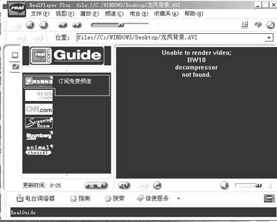 其实,只要安装相应的编码软件,上述问题就可迎刃而解,而如何知道AVI的编码方式就成了问题的关键。事实上我们常用的播放软件RealPlayer 8 Plus(不是RealOne Player)就可担此重任。以我下载的一个三维片头模板为例,其中素材AVI是非通用格式文件,试用了超级解霸、东方影都、Windows Media Player、RealOne Player等多种播放软件后,都是仅仅提示无法播放,却无解码器方面的提示。偶然的机会,尝试了一下RealPlayer 8 Plus,虽然打不开,却有了缺何种编码器的提示:“unable to render video,BW10 decompressor not found.”(见图),根据提示的编码器BW10,上网下载相关的解压驱动,问题得以解决。