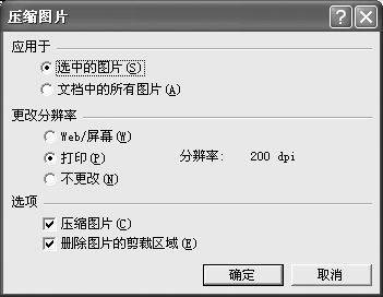 4.选中需要压缩的图片,单击右键选择菜单中的“设置图片格式”,选“图片”选项,在窗口的左下角有一个“压缩”按钮,单击此按钮,打开“压缩图片”窗口(见图),点选“选中的图片”,如果想压缩文档中的所有图片,则选“文档中的所有图片”。可按“屏幕/Web”或“打印”要求更改分辨率,选中“压缩图片”和“删除图片的剪裁区域”,单击“确定”,弹出对话框“是否优化”,单击“应用”。这样图片就处理好了。