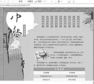 幸好有网络。随手打开哈尔滨信息港的“中秋专栏”(http://www.96963.com/jiaoliu/zq/zqms.htm),查找到了“中秋溯源”,里面不但有中秋节起源,还有嫦娥奔月、后羿射日等民间传说,继续浏览,又在“中秋风俗”中看到了历朝和各地的节日习俗,想知道的统统在上面。哈,这回可再不怕有人来问了。