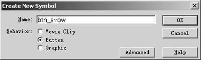 执行主菜单“Insert/New Symbol...”命令,在弹出“Creat New Symbol”对话框中定义一个名称为“btn_arrow”的按钮(图1),进入编辑按钮状态。在工具箱中选择“Oval Tool”工具,更改该工具属性的填充颜色为“#FFFFFF”,线条为“hairline”,在页面中心画一个圆,切换至“Arrow Tool”工具,选择该圆的边缘,按“Delete”键将它删除。同样,再利用“Line Tool”工具,在该圆的内部勾勒出一个向下的箭头,使用“#00FF00”色填充箭头内部,最后删除箭头外边线(图2)。