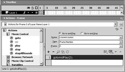 编辑“text up”Movie Clip,在时间轴上右键分别点击第1、2、3帧,执行“Insert Blank Keyframe”命令,插入空关键帧。选择第1帧,执行右键菜单中的“Actions”命令打开动作窗口,展开并双击“Actions/Movie Control/Stop”动作,将它添加到第1帧中(图3)。再为第2个关键帧添加Action为“Set Variable "/ text.scroll"=/ text.scroll-1”,即执行到第2帧时,会告知场景上的Text Field(变量名为text)目前所显示的行数往上移一行,实现向上滚动(图4)。最后设计第3个关键帧的Action为“Go to and Play(2)”实现与第2帧的循环(图5)。