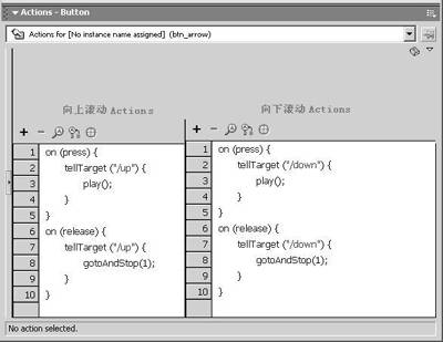 复制“text up”这个Movie Clip,并更名为“text down”,更改第2个关键帧的Action为“Set Variable "/ text.scroll"=/ text.scroll+1”,就是当执行到第2帧时,会告知场景上的Text Field目前所显示的行数往下移一行,实现向下滚动。