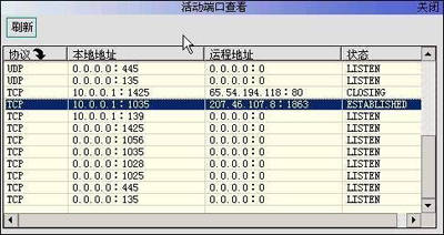 进入“活动端口查看”窗口,点击“刷新”按钮,即可查到本机地址、正在和本机传输数据的远程地址、数据协议、端口状态(图3)。其中“Listen”表示端口正处于监听状态等待远程联接;“Closing”表示端口已关闭无法传输数据;“Established”表示端口正在传输数据。