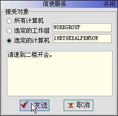 从扫描到的计算机列表里选中一台计算机,单击“发送消息”按钮,就会弹出“信使服务”窗口(图5)。我们可在其中选择给多台或单台计算机发送消息。